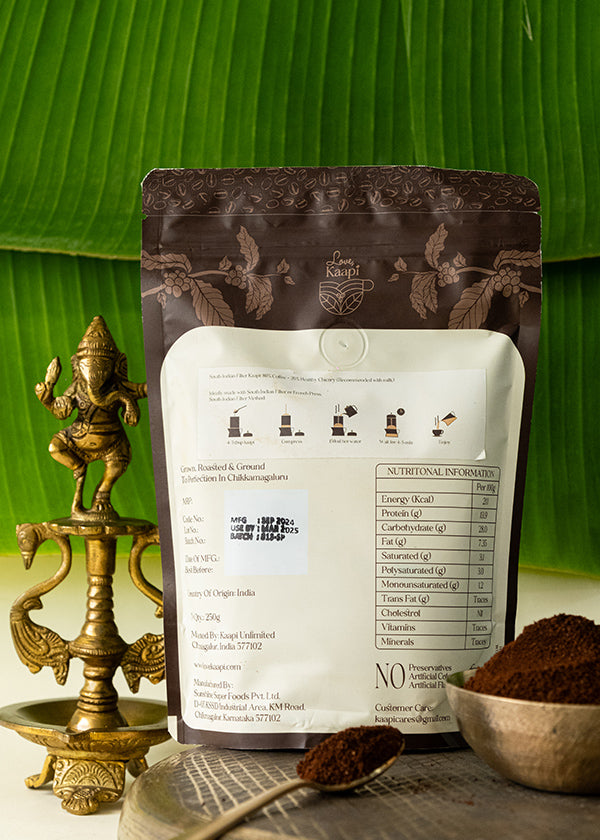 Our Kaapis work beautifully on most methods of manual brewing. South Indian FilterKaapi, Mysore Melody and Bangalore Bylanes work wonders when brewed with the South Indian Filter. And PureKaapi and Cold Brew deliver the best notes when brewed with a V60 or Aeropress